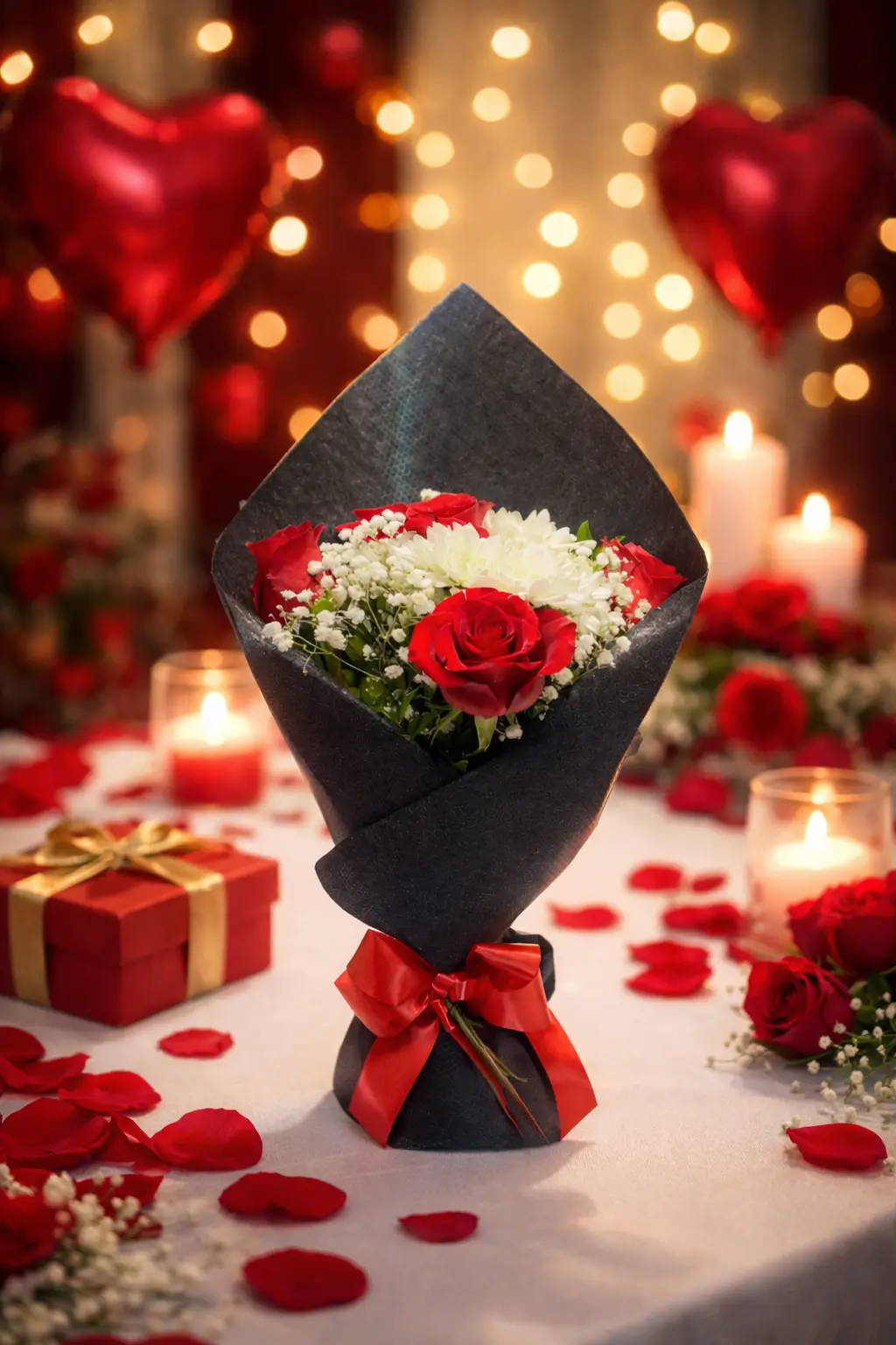 Ce bouquet saisissant marie l’intensité des roses rouges à la fraîcheur des chrysanthèmes blancs, le tout rehaussé par la délicatesse du gypsophile. L’écrin sombre et le ruban rouge accentuent son allure noble et passionnée. Mille et une Fleurs s’unissent ici pour offrir une composition élégante et contrastée, idéale pour les gestes romantiques ou les célébrations marquantes.