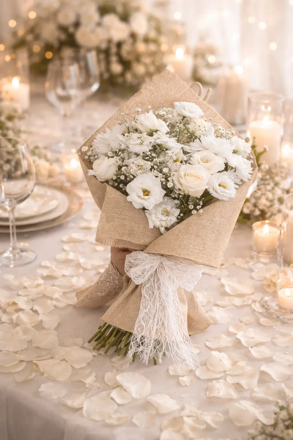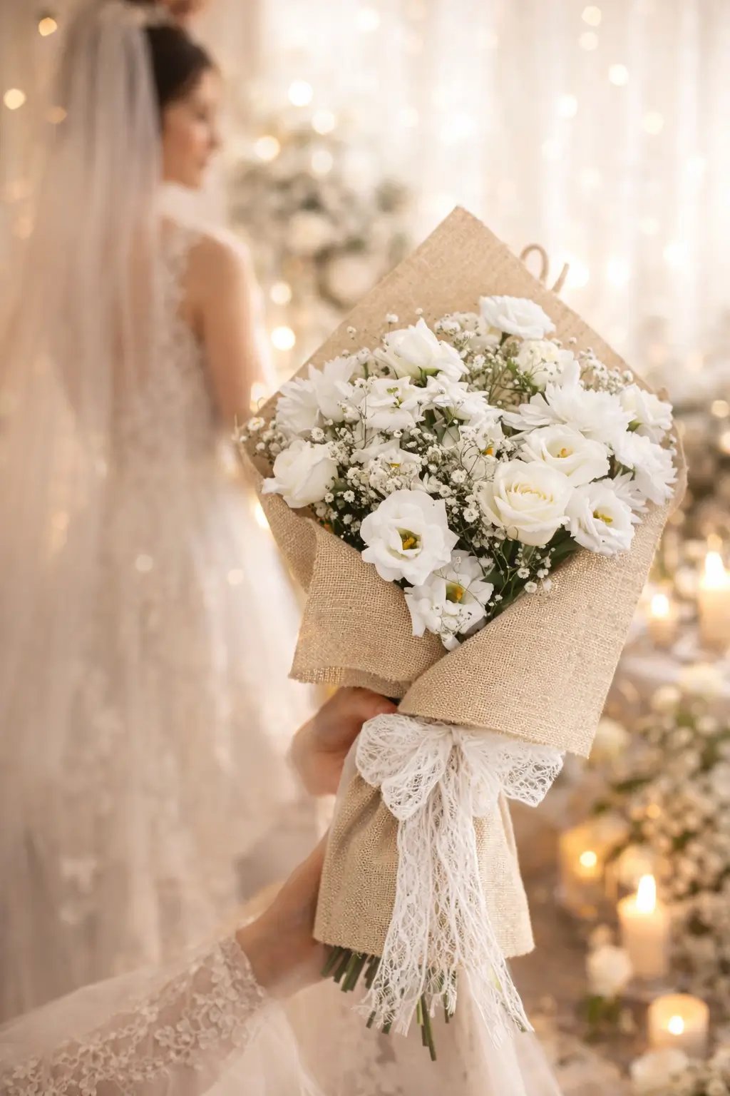 Le gypsophile, avec ses petites fleurs légères et aériennes, agit comme une dentelle florale. Il enveloppe l’ensemble d’un voile de douceur, créant un effet de nuage qui sublime les protagonistes principaux. Sa légèreté confère au bouquet une aura de raffinement, une impression de légèreté infinie qui transforme la composition en une œuvre presque immatérielle. Il est le souffle poétique qui adoucit les contrastes et qui magnifie la blancheur éclatante des roses et des lisianthus.