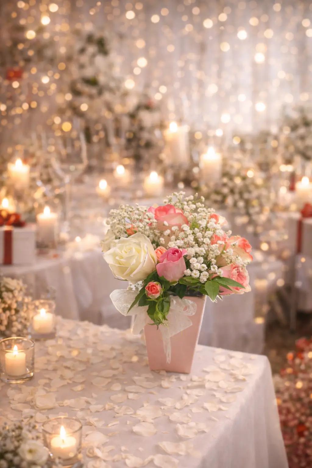 Un petit vase rose pâle, délicatement orné d’un ruban blanc, accueille une composition florale élégante. Le bouquet est composé de plusieurs variétés de roses : blanches, roses et pêche, qui se mêlent harmonieusement. De petites fleurs blanches, semblables à du gypsophile (souvent appelé « baby’s breath »), apportent une touche de légèreté et de finesse. Des feuilles vertes, discrètes mais bien placées, ajoutent du contraste et de la profondeur à l’ensemble.