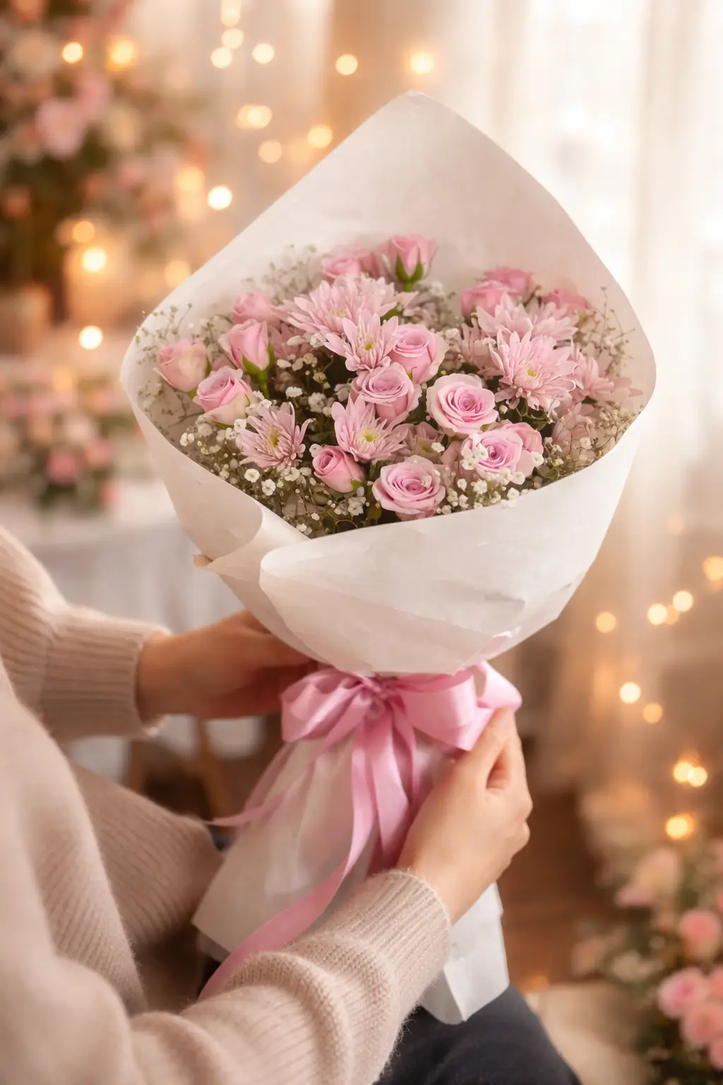 Ce bouquet raffiné associe la tendresse des roses roses à l’élégance des chrysanthèmes et la légèreté du gypsophile. L’ensemble, enveloppé de papier blanc et rehaussé d’un ruban rose, incarne la délicatesse et la grâce des instants précieux. Mille et une Fleurs s’unissent ici pour offrir une composition tendre et élégante, idéale pour célébrer l’amour, les anniversaires ou les moments de gratitude.