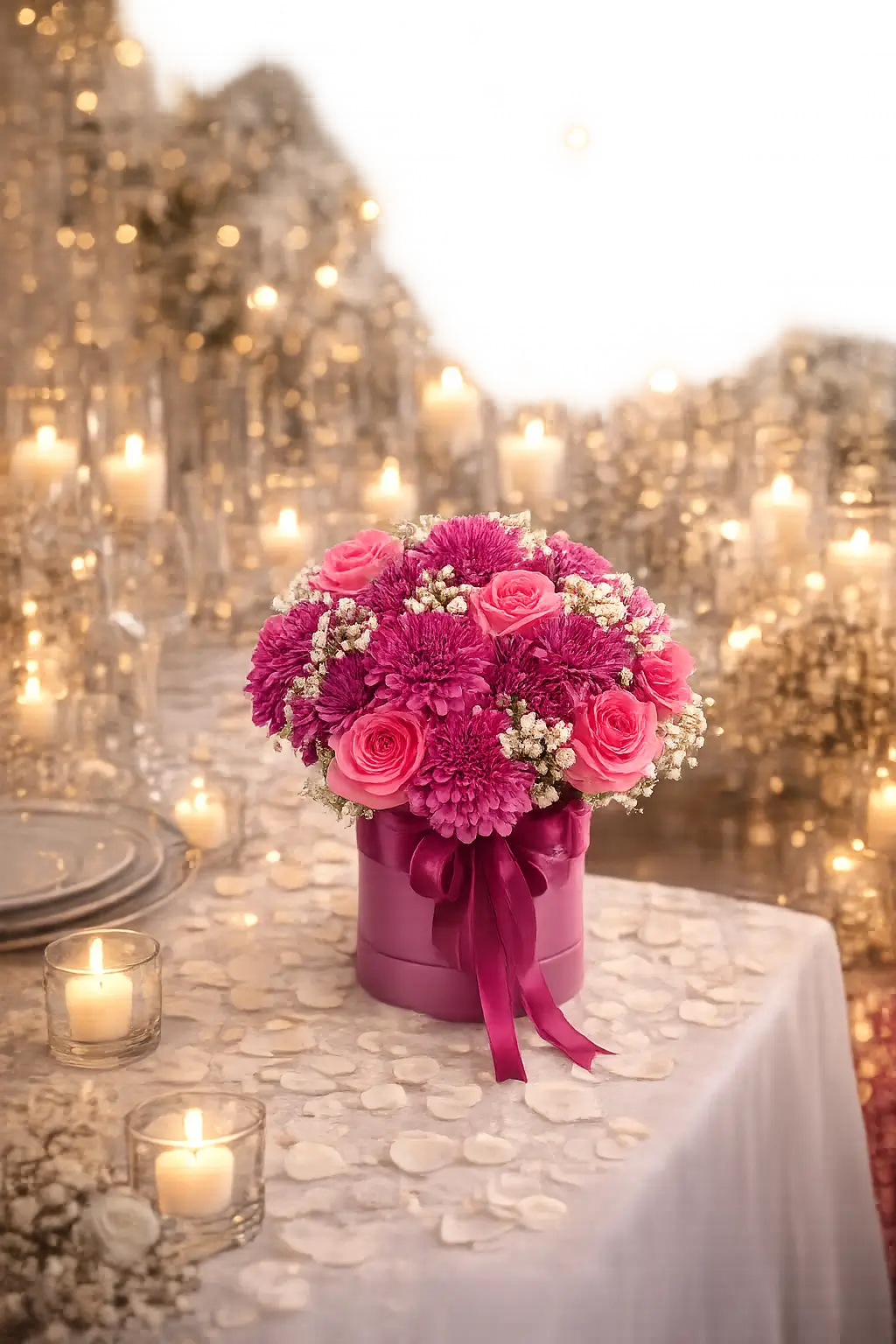 Le socle rond, orné d’un ruban rose délicat, apporte stabilité et élégance à l’ensemble. Il agit comme un écrin raffiné, mettant en valeur la richesse des couleurs et la forme harmonieuse du bouquet. Le ruban, noué avec soin, rappelle la tendresse des roses et confère une cohérence esthétique à la composition. Ce détail raffiné souligne l’attention portée à chaque élément et transforme le bouquet en une pièce décorative digne des plus belles célébrations.