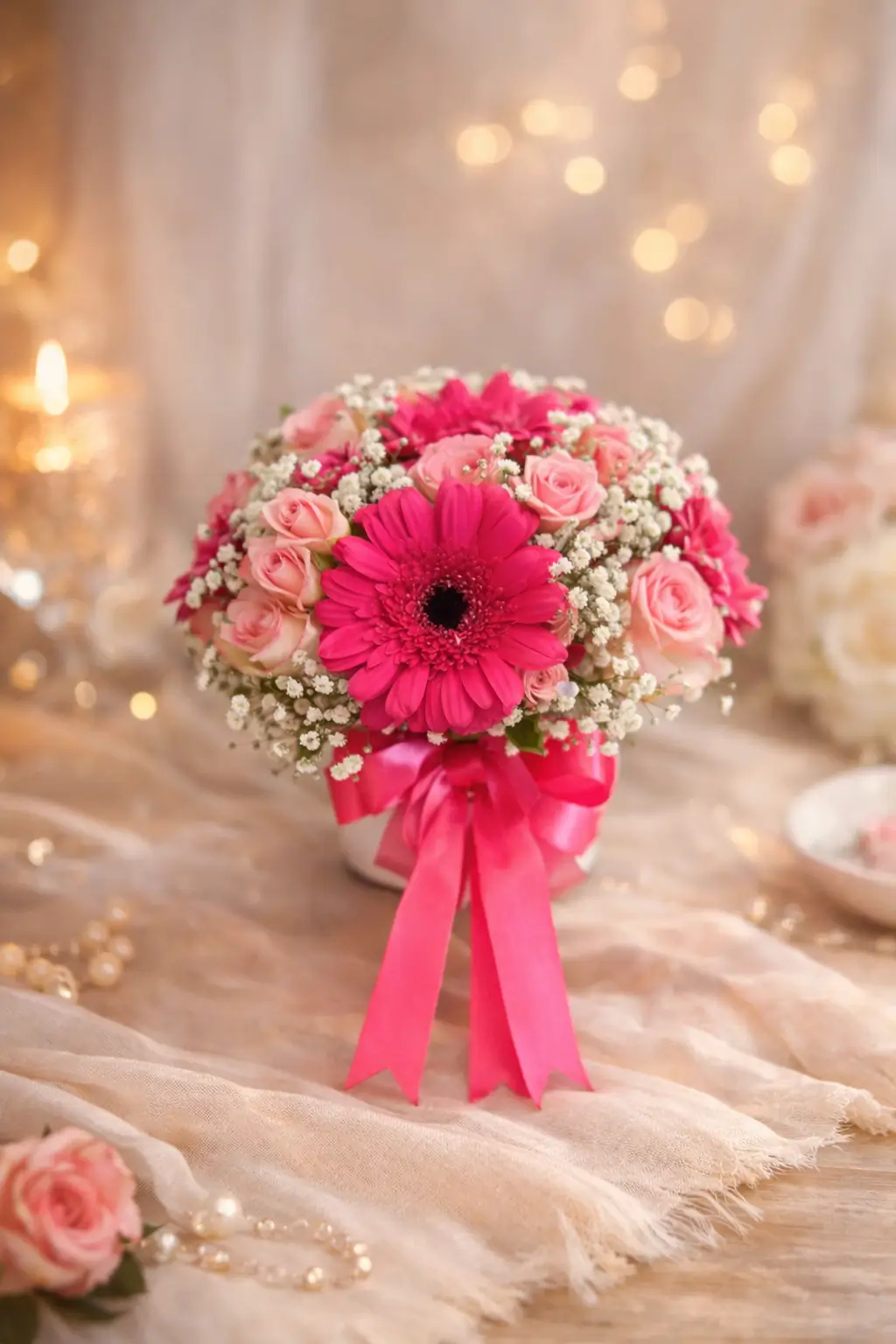Bouquet raffiné composé d’une grande gerbera rose au centre, entourée de roses roses et de délicates fleurs de gypsophile, lié d’un ruban rose éclatant.