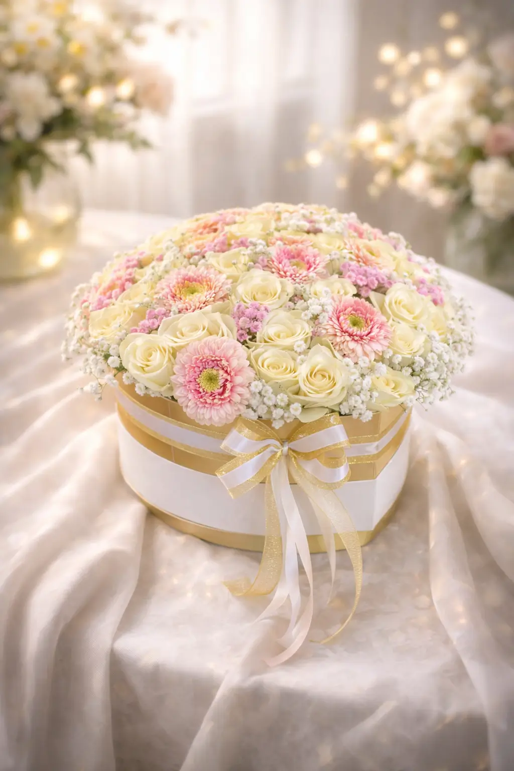 Le socle de cette création est une boîte décorative blanche et dorée, élégante et moderne. À l’avant, un ruban satiné blanc et or, noué en un nœud parfait, vient sublimer la composition. Ce détail raffiné agit comme une signature visuelle : il attire l’œil, souligne la cohérence chromatique et ajoute une touche festive. Mille et une Fleurs démontre ici son savoir-faire en associant la subtilité des couleurs pastel à l’éclat du doré, créant une œuvre qui allie tradition et modernité.