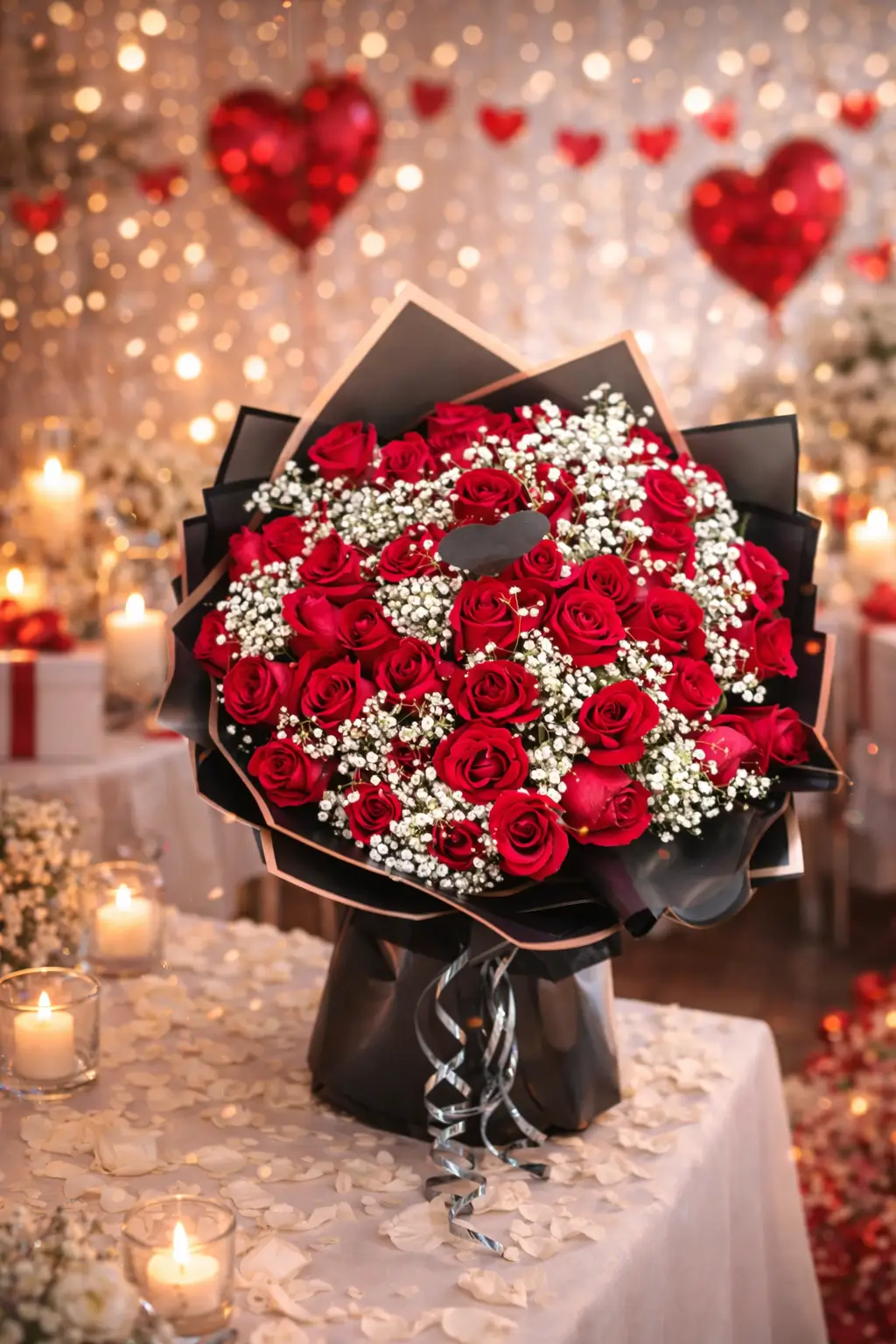 Ce bouquet raffiné associe la passion des roses rouges à la délicatesse du gypsophile, sublimé par un écrin noir et or. Le petit cœur décoratif au centre ajoute une touche intime et personnalisée. Mille et une Fleurs s’unissent ici pour offrir une composition élégante et luxueuse, idéale pour les gestes romantiques ou les célébrations d’exception.