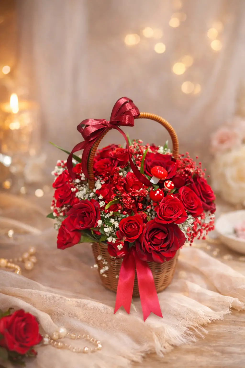 En définitive, le Panier Enchanté Mille et une Fleurs est une symphonie florale et décorative, où chaque élément joue sa partition pour créer une œuvre harmonieuse. Les roses rouges incarnent la passion, les gypsophiles blanches la pureté, les champignons la fantaisie, et le panier en osier la chaleur de la nature. Ensemble, ils composent une scène vivante, festive et poétique, capable de transformer n’importe quel espace en un lieu empreint de beauté et de magie.