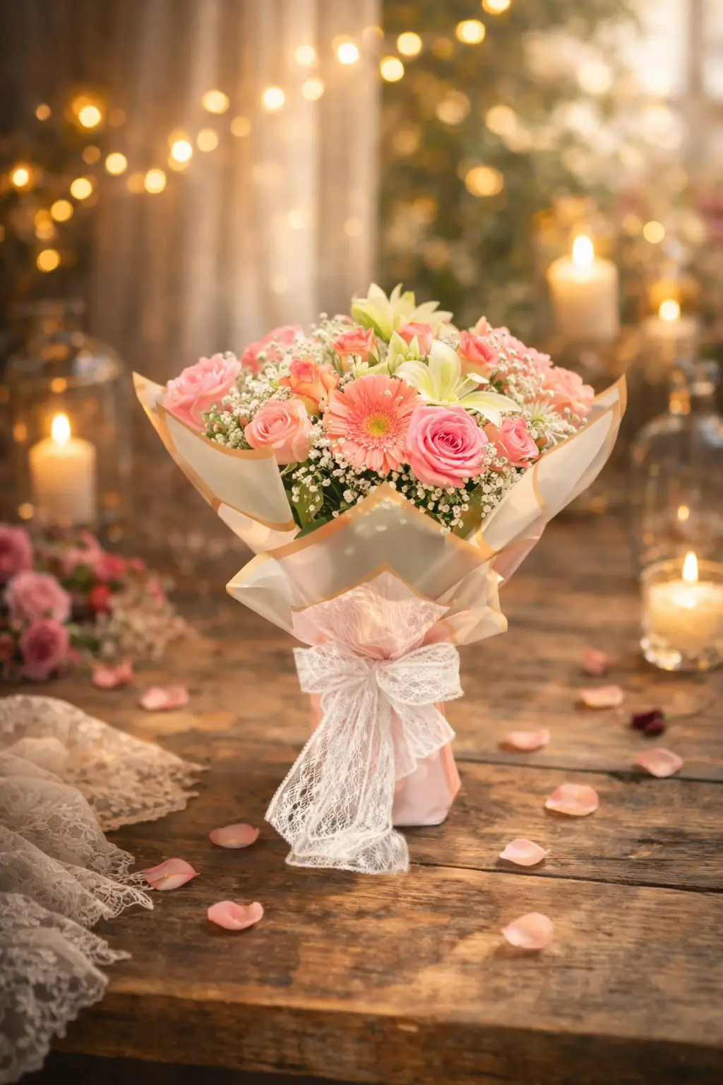 Pour un anniversaire, ce bouquet est une déclaration de joie et de reconnaissance. Les gerberas roses, éclatants, expriment la fête et la vitalité, tandis que les roses rappellent l’affection profonde. Offrir ce bouquet, c’est dire à la personne célébrée : « Tu es chère à mon cœur, et ta présence illumine ma vie. »