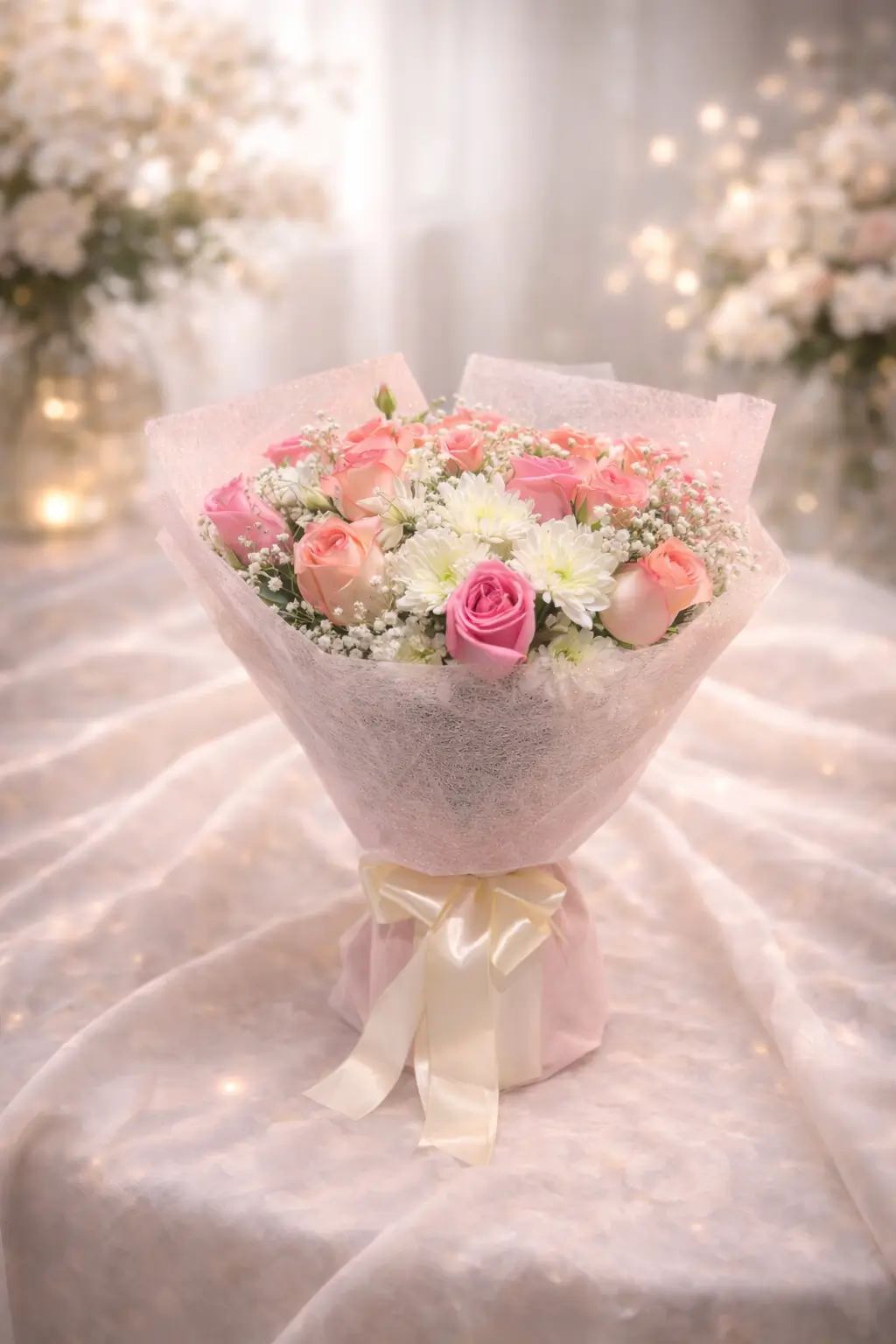 Ce bouquet délicatement enveloppé de papier rose et blanc, noué d’un ruban satiné, incarne la tendresse et l’élégance. Les roses aux teintes rosées et pêche se marient à la pureté des fleurs blanches pour créer une composition raffinée. Mille et une Fleurs s’expriment ici dans une palette romantique, idéale pour célébrer l’amour, l’amitié ou les instants précieux.