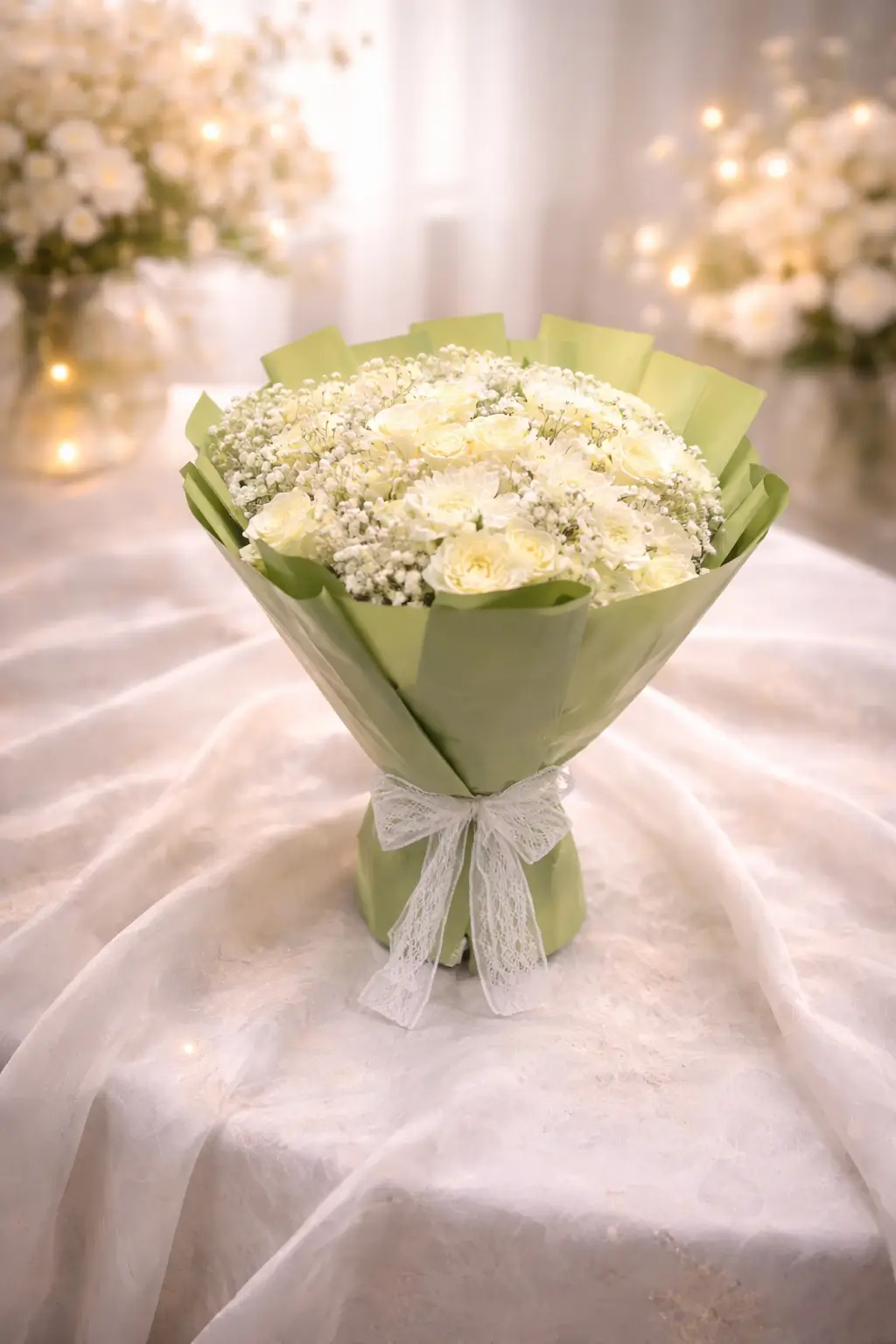 À première vue, le bouquet présente une silhouette compacte et généreuse. Les têtes florales sont disposées de manière à former une masse arrondie, sans excès ni dispersion, ce qui donne au bouquet une allure soignée et maîtrisée. Le choix du papier d’emballage vert crée un contraste subtil avec la blancheur des fleurs, apportant une touche de fraîcheur et rappelant la nature qui les a vues naître. Le ruban en dentelle blanche qui retient l’ensemble ajoute une note romantique et artisanale, comme si le bouquet avait été préparé avec attention par les artisans de Mille et une Fleurs pour un moment particulier.