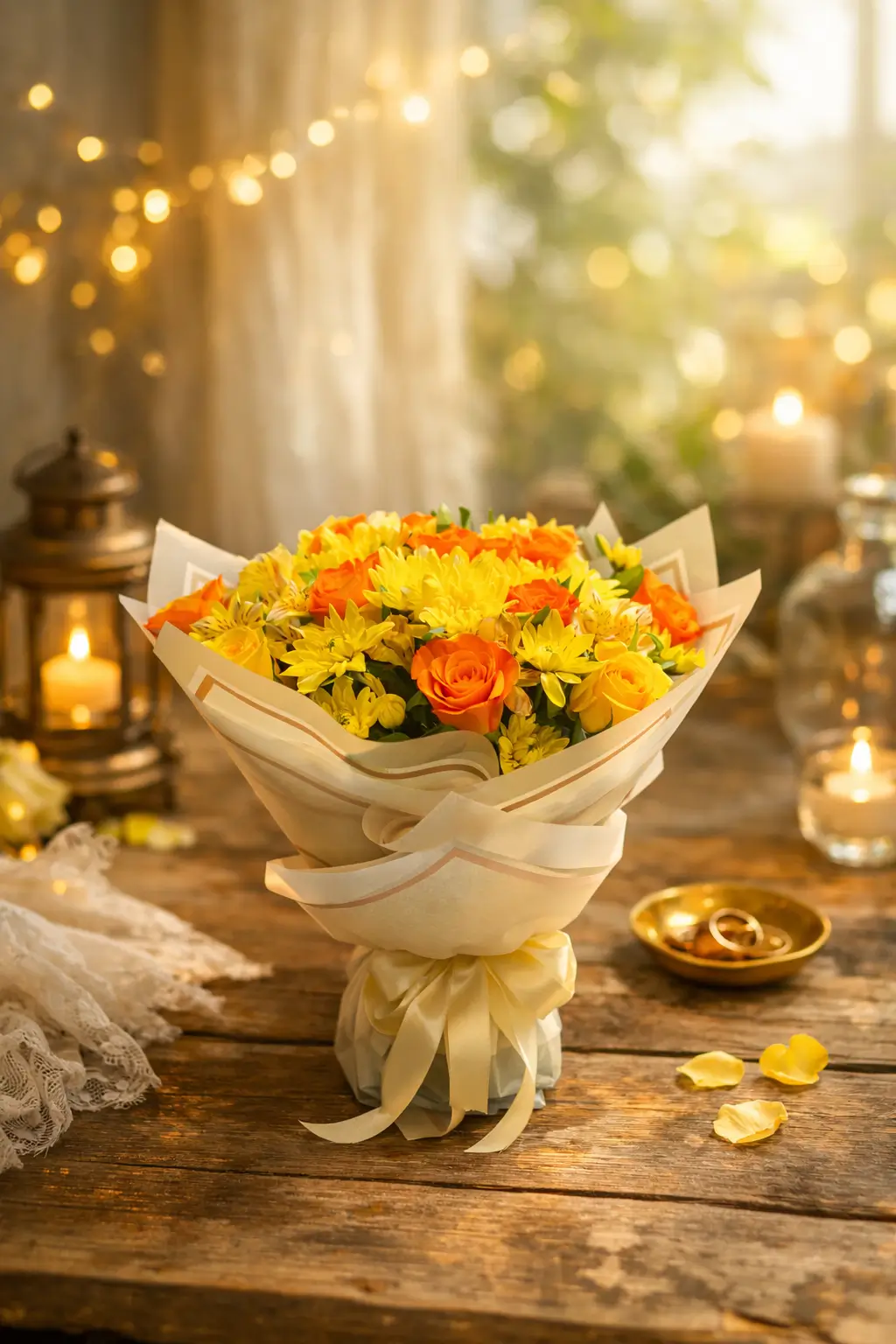 Ce bouquet lumineux, composé de roses et chrysanthèmes aux teintes solaires, est enveloppé d’un papier crème délicat et rehaussé d’un ruban jaune assorti. Il incarne la joie, l’énergie et la chaleur des instants festifs. Mille et une Fleurs s’unissent ici pour offrir une explosion de couleurs radieuses, parfaite pour illuminer les célébrations et transmettre un message de vitalité.